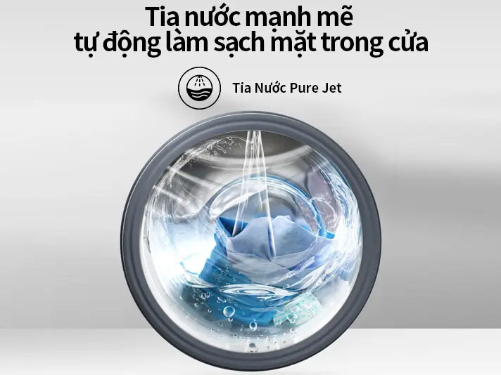 Với hệ thống Pure Jet, máy tạo ra tia nước mạnh mẽ tự động làm sạch cặn bẩn và bột giặt còn sót lại trên vòng đệm cửa và mặt trong cửa. Bạn không cần phải vệ sinh thủ công, giúp tiết kiệm thời gian và công sức.
