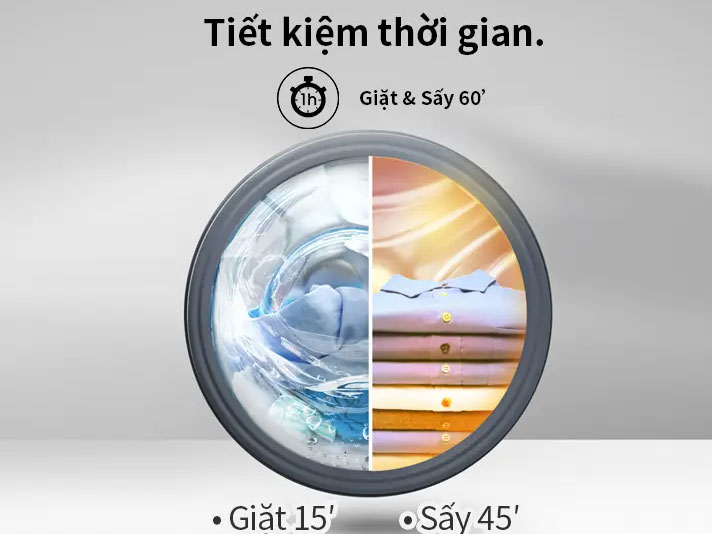 Máy có chương trình giặt và sấy nhanh chỉ trong 60 phút, lý tưởng cho những ngày bận rộn hoặc khi bạn cần quần áo sạch sẽ gấp. Chỉ mất 15 phút để giặt và 45 phút để sấy khô cho quần áo dưới 1kg, giúp tiết kiệm thời gian tối đa mà không cần phải phơi khô.