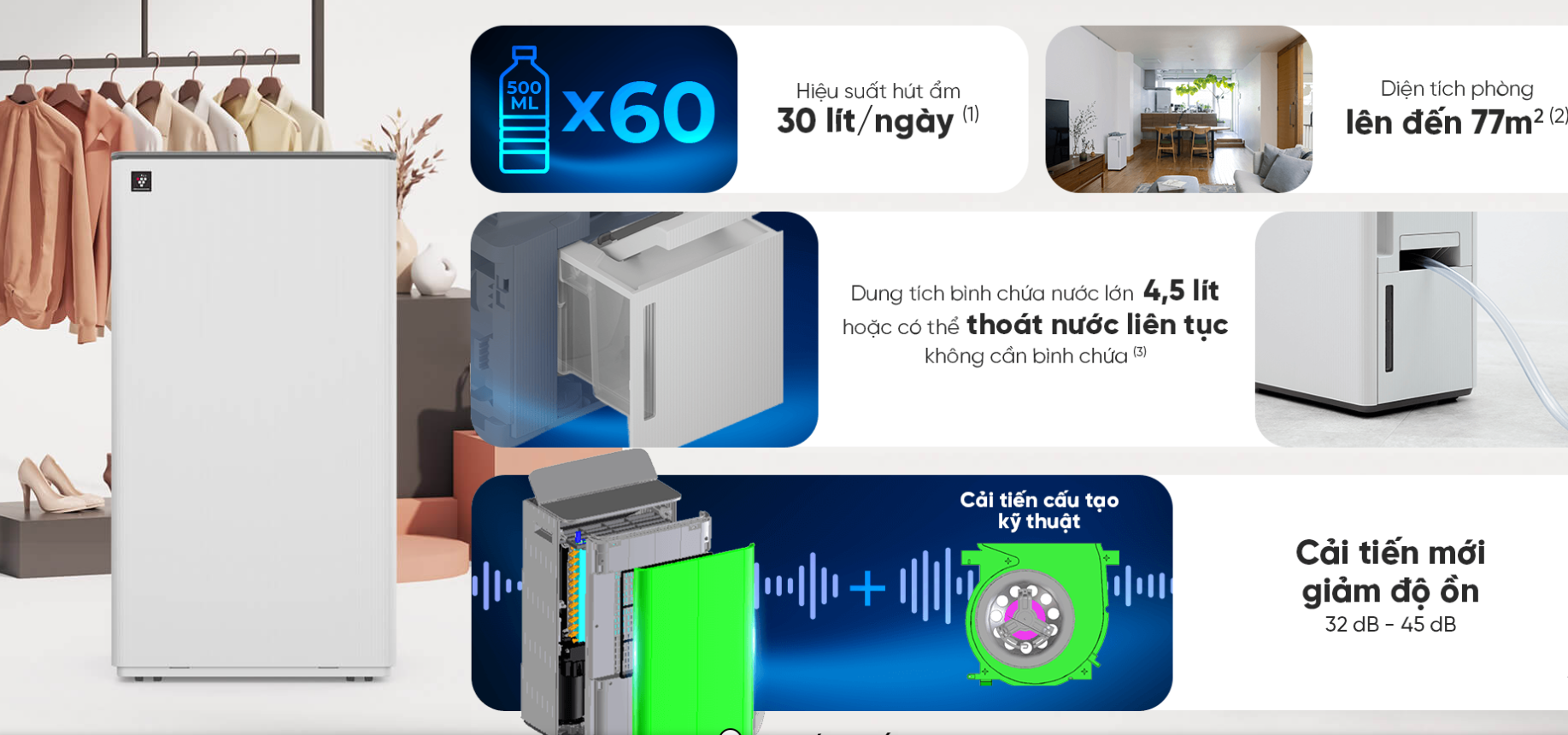 Máy có công suất hút mạnh mẽ, hút ẩm lên đến 30L/ngày (khi phòng có nhiệt độ là 30 độ C, với độ ẩm là 80%) thích hợp sử dụng cho những căn phòng diện tích lên đến 77m². Sản phẩm đặc biệt hiệu quả trong việc chống ẩm mốc, bảo vệ quần áo, đồ nội thất và thiết bị điện tử khỏi hư hại do độ ẩm cao.