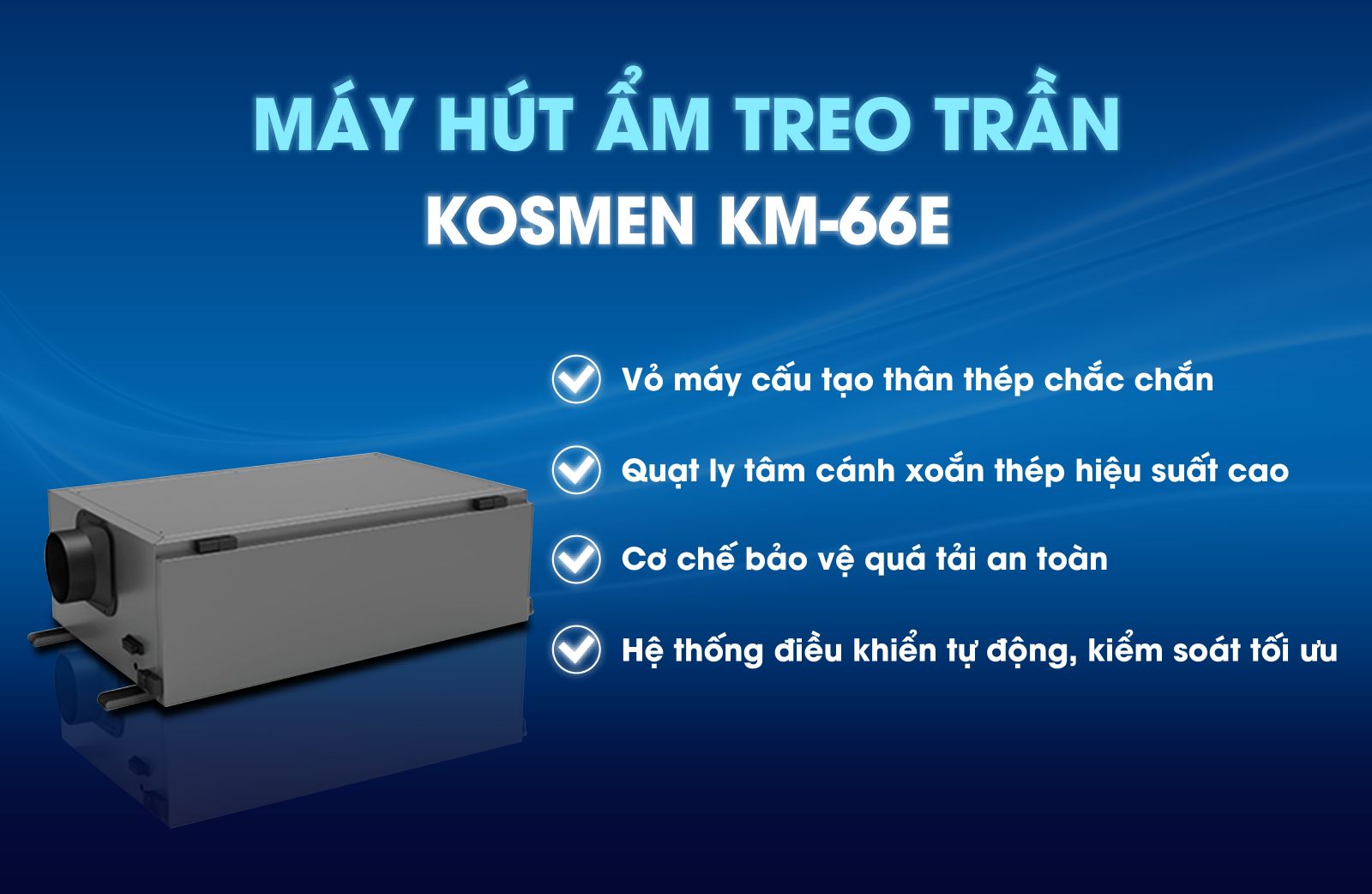 Máy hút ẩm treo trần Kosmen KM-66E được cải tiến đặc biệt phù hợp với điều kiện khí hậu ở Việt Nam và trang bị nhiều tính năng tiện ích. Thiết bị sở hữu nhiều ưu điểm vượt trội vừa mang lại hiệu quả hút ẩm cao đồng thời có khả năng tiết kiệm diện tích không gian lắp đặt so với các dòng hút ẩm thông thường.