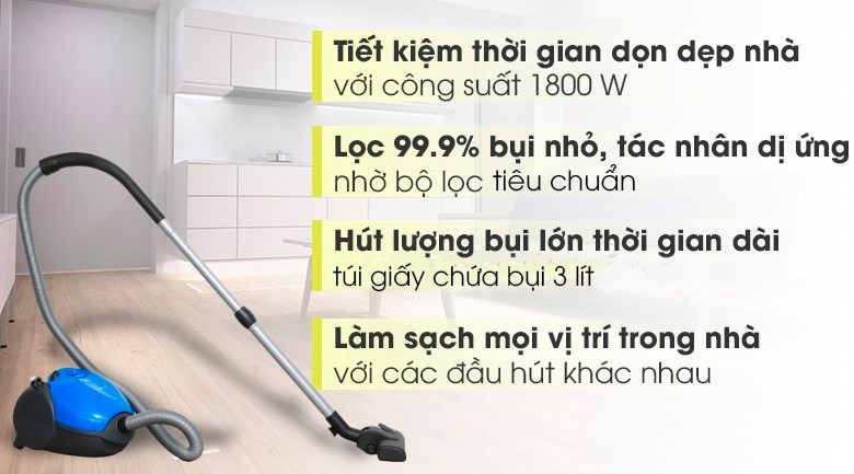 Công suất 1800W hút mạnh mẽ, sử dụng bộ lọc tiêu chuẩn loại bỏ 99.9% hạt bụi nhỏ gây dị ứng