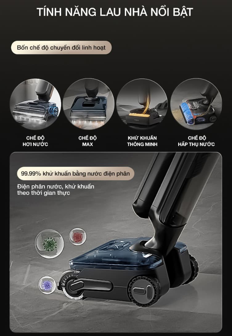 di chuyển dễ dàng và linh hoạt trong mọi không gian. Bạn có thể điều khiển máy theo mọi hướng mà không gặp trở ngại, từ việc làm sạch dưới các đồ đạc thấp đến việc tiếp cận các góc cạnh khó khăn. Bên cạnh đó, máy còn được trang bị cảm biến siêu nhạy bén, giúp tự động nhận diện và điều chỉnh lực hút phù hợp với mức độ bẩn, mang lại hiệu quả làm sạch tối ưu và giúp bạn dễ dàng tiếp cận mọi ngóc ngách trong ngôi nhà mà không tốn công sức.