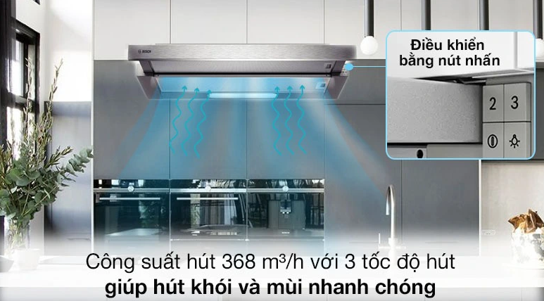 – Máy hút mùi Bosch hút đẩy trực tiếp bằng ống thoát khí có đường kính 12 cm, xử lý được lượng khói lớn.