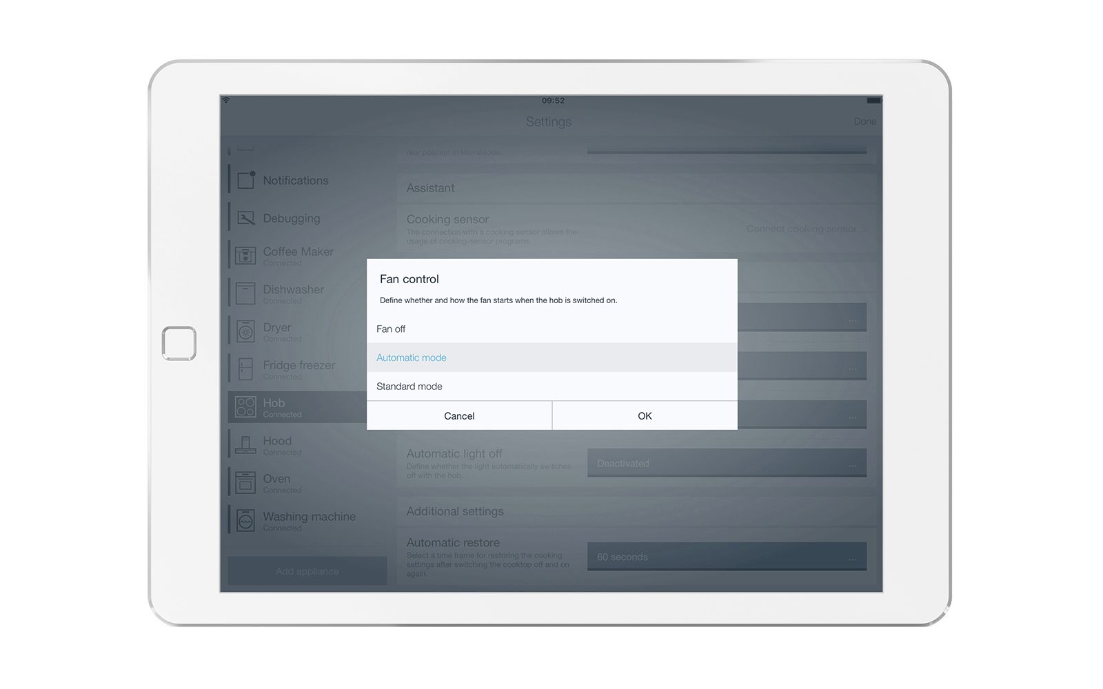 Nhiều thao tác điều khiển thiết bị bếp và máy hút mùi khi nấu ăn thường có thể gây căng thẳng hơn là thú vị. AutoControl cho phép bạn điều khiển máy hút mùi và bếp nấu được đồng bộ hóa qua Wi-Fi chỉ bằng một nút bấm.