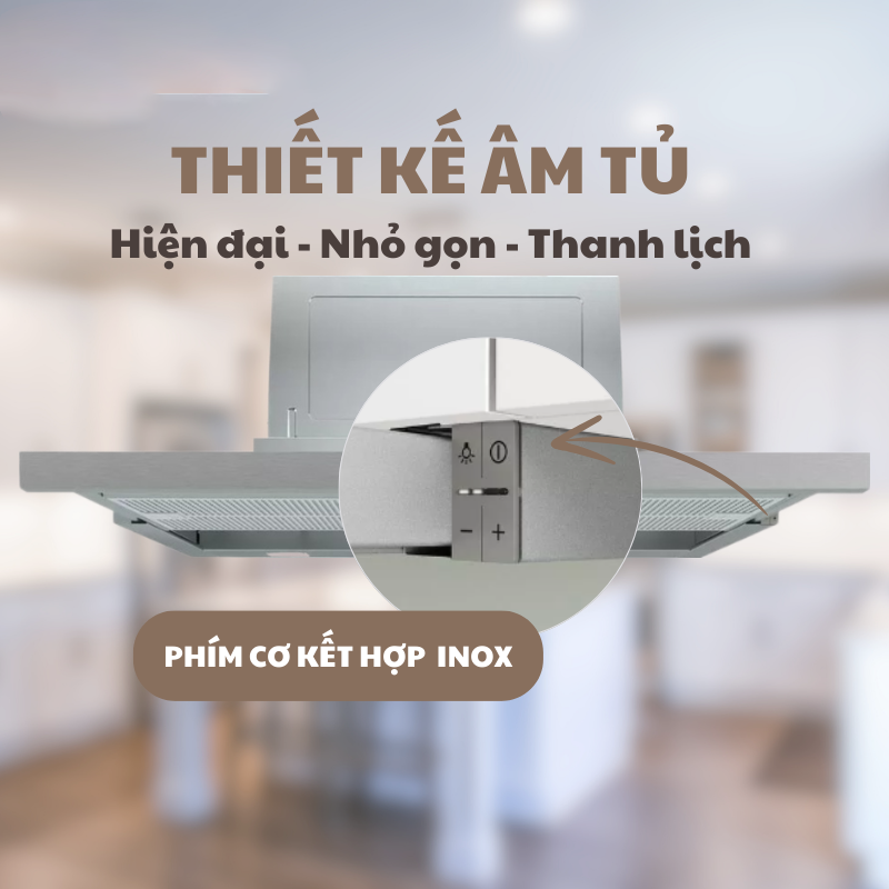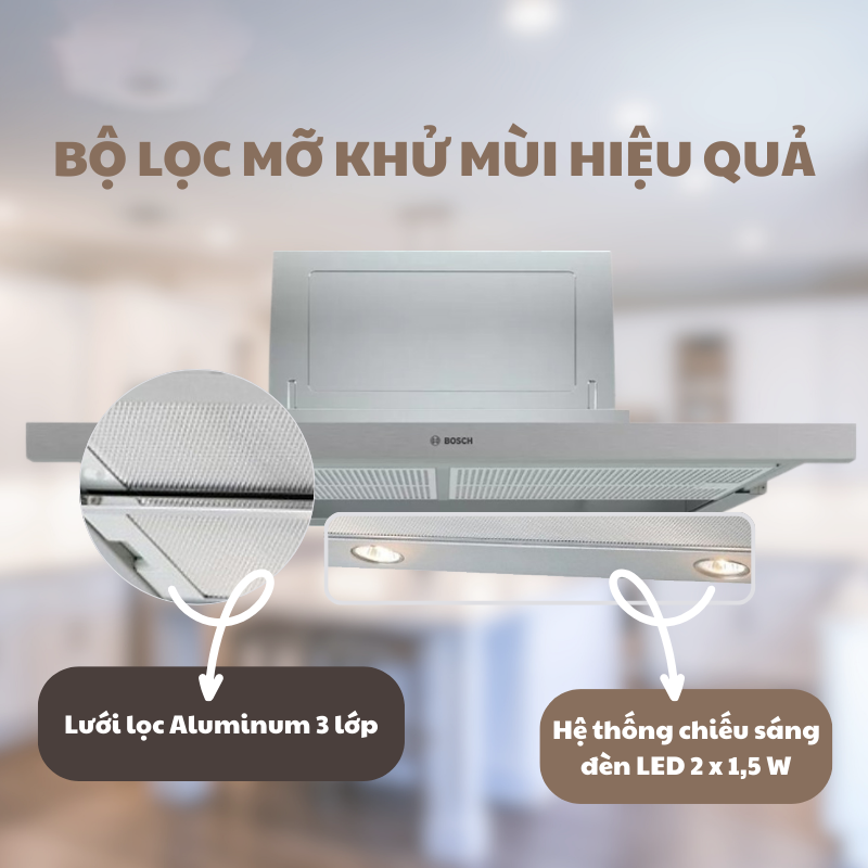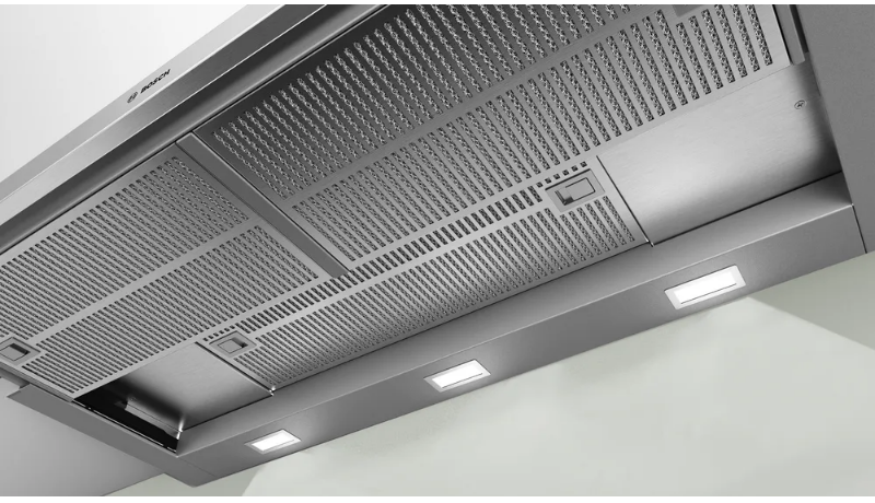 Bosch DFS097A51B được thiết kế dạng âm tủ, có thể lắp đặt gọn gàng bên trong tủ bếp treo tường (kích thước 60 hoặc 90cm), giúp tiết kiệm không gian tối đa và mang lại vẻ đẹp liền mạch cho căn bếp. Với màu bạc kim loại sang trọng cùng thanh trượt làm bằng thép không gỉ