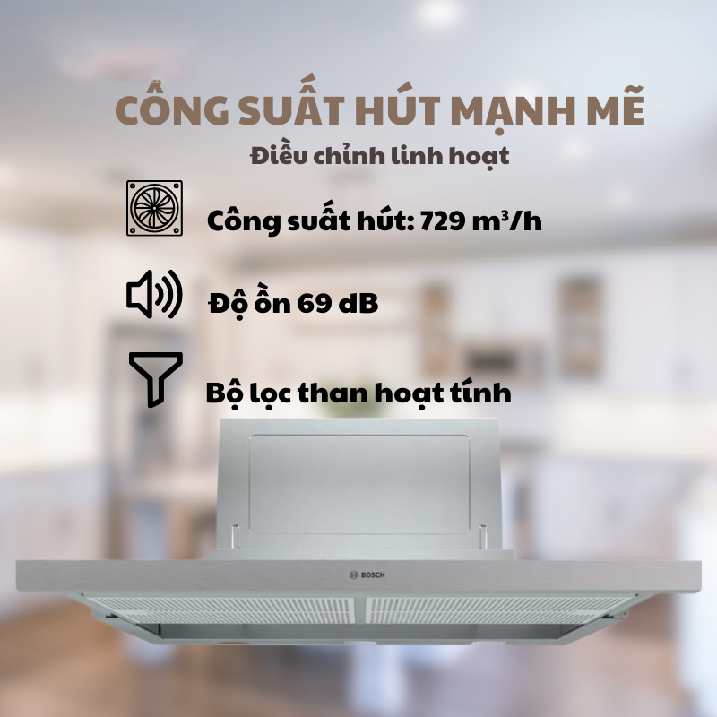 Mặc dù có thiết kế nhỏ gọn, DFS097A51B lại sở hữu công suất hút mùi đáng kinh ngạc. Theo tiêu chuẩn EN 61591, máy có khả năng hút tối đa 397 m³/h ở chế độ thông thường và lên đến 729 m³/h ở chế độ tăng cường khi sử dụng ống dẫn khí đường kính 15cm. Với 3 mức công suất hút và 1 chế độ tăng cường, người dùng có thể dễ dàng điều chỉnh lực hút phù hợp với từng loại món ăn và mức độ mùi khác nhau.