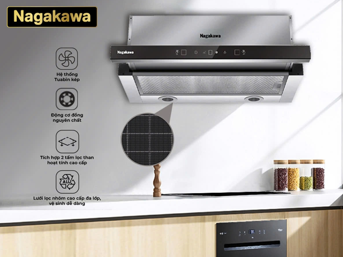 Máy hút mùi cao cấp Nagakawa NKKH01M70 trang bị động cơ tuabin đôi (động cơ lồng sóc) giúp hút mùi khỏe hơn, kiểm soát độ ồn hiệu quả, đảm bảo không gian nấu nướng thoải mái cho người sử dụng.