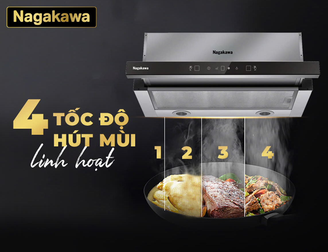 Máy hút mùi, khử mùi Nagakawa NKKH01M70 có 4 tốc độ hút mùi cho người dùng lựa chọn linh hoạt tùy thuộc vào nồng độ mùi trong nhà bếp.