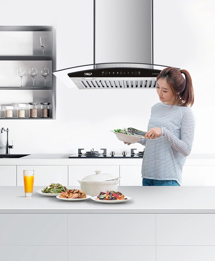 Máy hút mùi EH-R502E7D có thiết kế dạng kính cong mềm mại, bề mặt phủ kính cường lực hiện đại