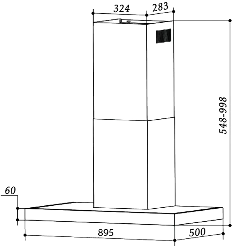 Kích thước của máy hút mùi Eurogold EUH03190 là R895 x S500 x C(554-998) mm.