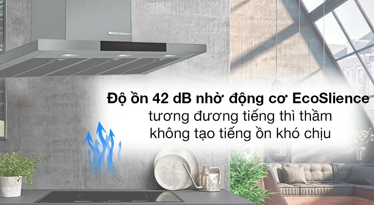3. Máy hút mùi DWB97DM50 trang bị động cơ EcoSilence , Hoạt yên tĩnh với độ ồn 42 dB không gây ra tiếng ồn gây khó chịu cho bạn