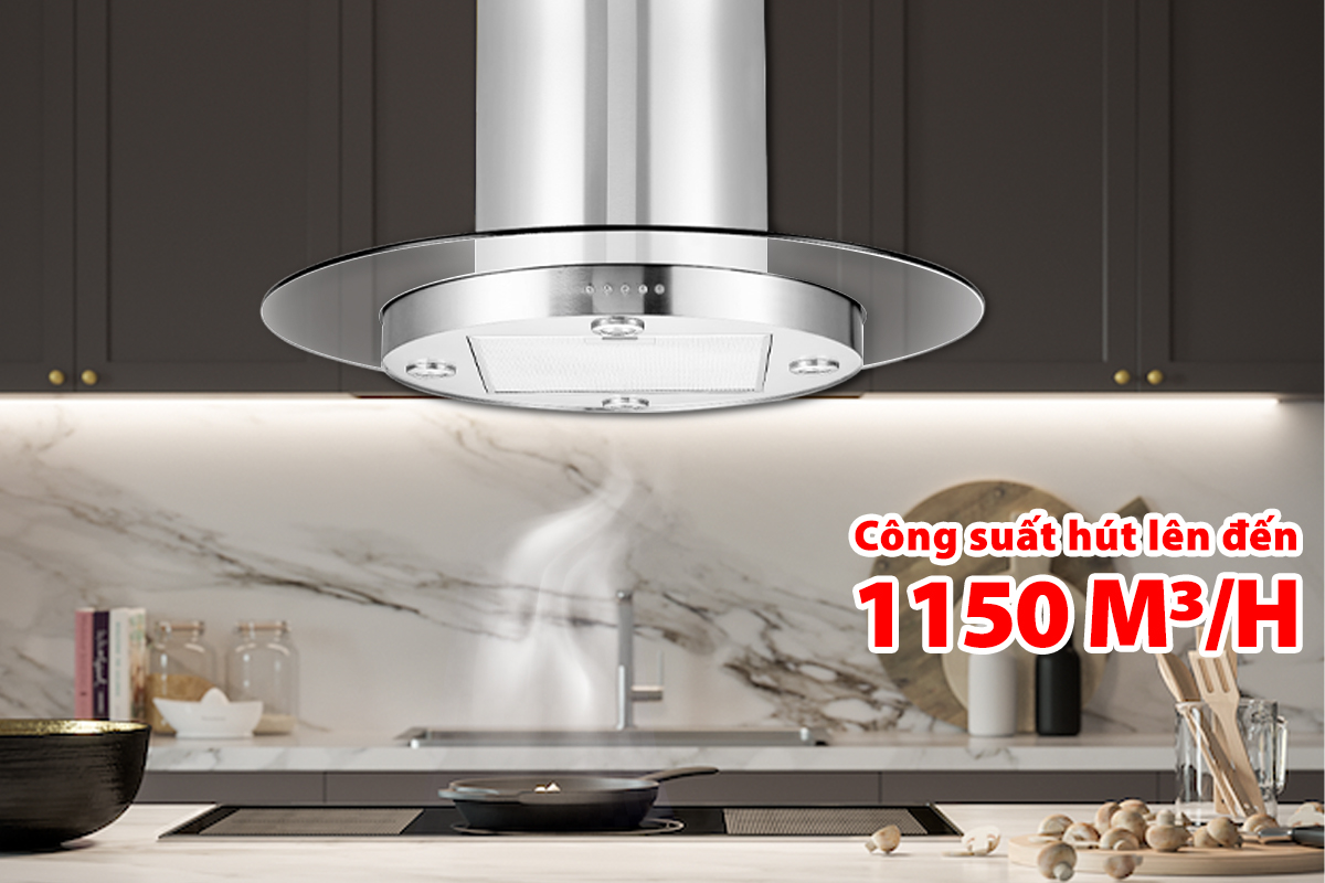 Máy hút mùi đảo Lorca TA-6009-90 được trang bị động cơ tua bin đôi nhằm tạo ra một công suất hút lớn nhất. Công suất động cơ 195W, công suất hút cực mạnh 1150m3/h giúp hút hết các mùi thức ăn làm sạch không khí mang lại cho căn bếp luôn thông thoáng.