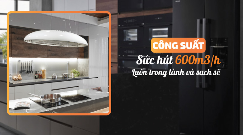 Máy hút mùi đảo được lắp đặt từ trên xuống với chiều dài 90cm, cao 56cm rất phù hợp cho những căn bếp lớn, thường kết hợp với phòng khách. Việc treo cao cũng giúp máy hút mùi hoạt động hiệu quả hơn, đảm bảo khử mùi sạch sẽ và tối ưu.