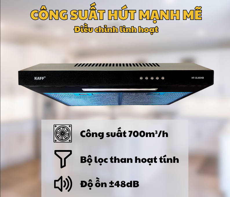 Máy hút mùi Kaff KF-SL60KB có độ ồn rất thấp, độ ồn tối đa của máy khi hoạt động với công suất cao nhất là ở mức 48dB không gây ồn ào khó chịu khi sử dụng và không làm ảnh hưởng đến sinh hoạt của gia đình bạn.