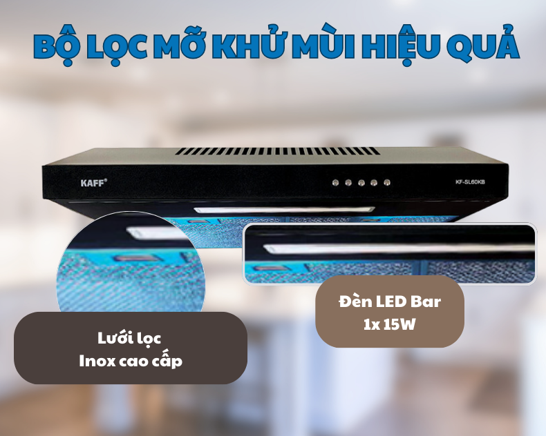 Máy hút mùi Kaff KF-SL60KB được trang bị tấm lưới lọc bằng Inox + hợp kim nhôm 3 lớp thông thoáng và chắc chắn. Bạn sẽ dễ dàng tháo lắp tấm lọc này giúp cho việc vệ sinh trở nên nhanh chóng và đơn giản. Bạn có thể ngâm nước nóng cho tan bớt dầu mỡ sau đó đánh rửa bằng các chất tẩy rửa thông thường. Việc thường xuyên vệ sinh sẽ giúp bảo vệ động cơ máy bên trong, nâng cao tuổi thọ sản phẩm.