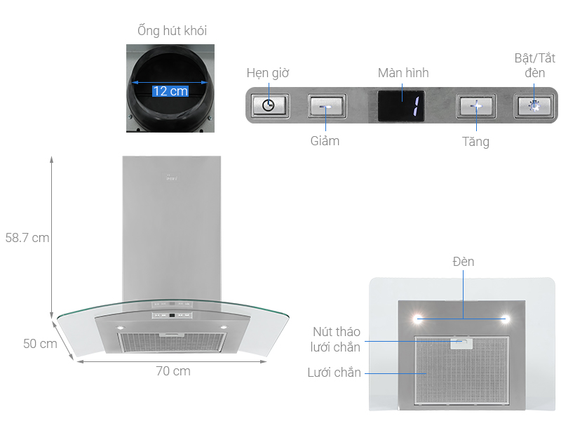 – Chiều ngang 70 cm có thể hút mùi hiệu quả cho bếp có 2 vùng nấu, lựa chọn thích hợp cho nhà ở, căn hộ chung cư có diện tích vừa và rộng.