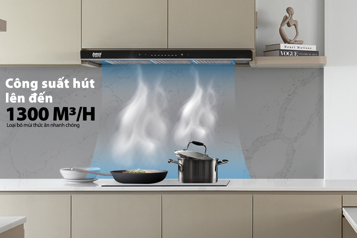Máy hút mùi TA-6007TM trang bị mô-tơ BLDC hoạt động ổn định với công suất 100W với công suất hút 1300m³/h giúp việc khử mùi được tốt hơn, hỗ trợ tạo luồng gió mới cho căn bếp của gia đình.