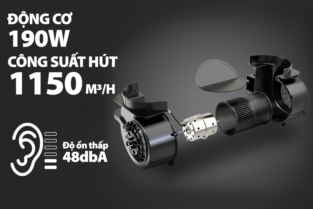 Máy hút mùi Lorca TA-2001C-90 được trang bị động cơ tua bin đôi nhằm tạo ra một công suất hút lớn nhất. Công suất động cơ 190W, công suất hút cực mạnh 1050m3/h giúp hút hết các mùi thức ăn làm sạch không khí mang lại cho căn bếp luôn thông thoáng.