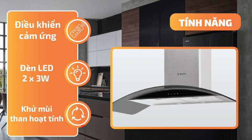 Máy hút mùi áp tường được trang bị công nghệ khử mùi bằng than hoạt tính và đường ống thoát ra ngoài Ø150, giúp loại bỏ mùi hôi trong căn bếp một cách hiệu quả.