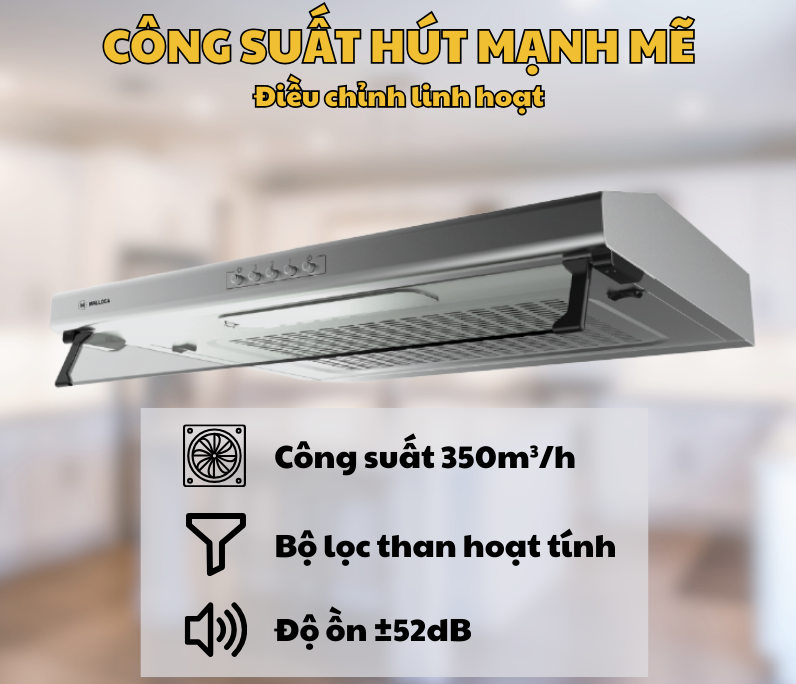 Với công suất hút lên đến 350 m³/h, Malloca H107 có khả năng xử lý hiệu quả lượng khói và mùi phát sinh trong quá trình nấu nướng của các gia đình thông thường. Đặc biệt, máy hoạt động tương đối êm ái với độ ồn dưới 52 dB, không gây cảm giác khó chịu, giúp bạn tận hưởng trọn vẹn không gian nấu nướng.