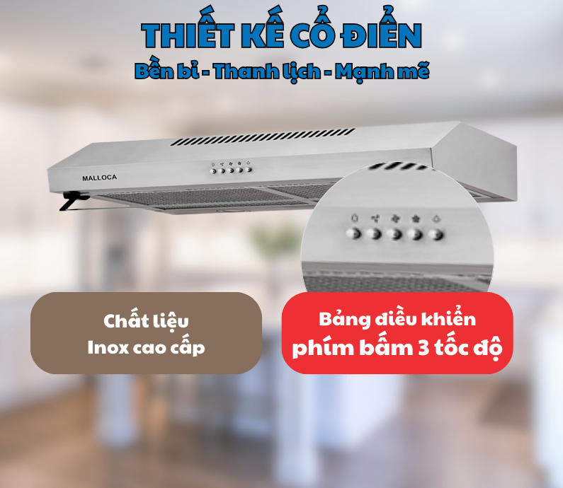 Malloca H365.7 được trang bị hệ thống điều khiển bằng nút nhấn, cho phép bạn dễ dàng chọn một trong ba tốc độ hút khác nhau. Tùy thuộc vào mức độ mùi trong nhà bếp, bạn có thể điều chỉnh tốc độ thích hợp để đảm bảo không gian luôn thoáng mát và sạch sẽ.
