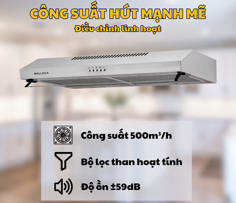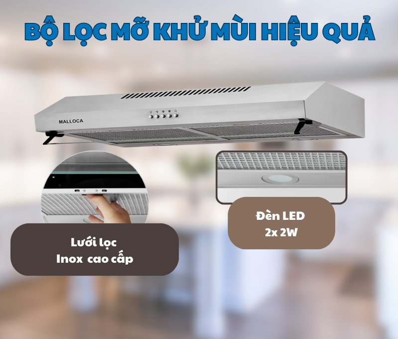 Một trong những ưu điểm nổi bật của máy hút mùi Malloca H365.7 là khả năng khử mùi hiệu quả nhờ sử dụng than hoạt tính. Kết hợp với đường ống thoát ra ngoài Ø120, máy đảm bảo mùi khói được dẫn ra bên ngoài một cách nhanh chóng và triệt để.