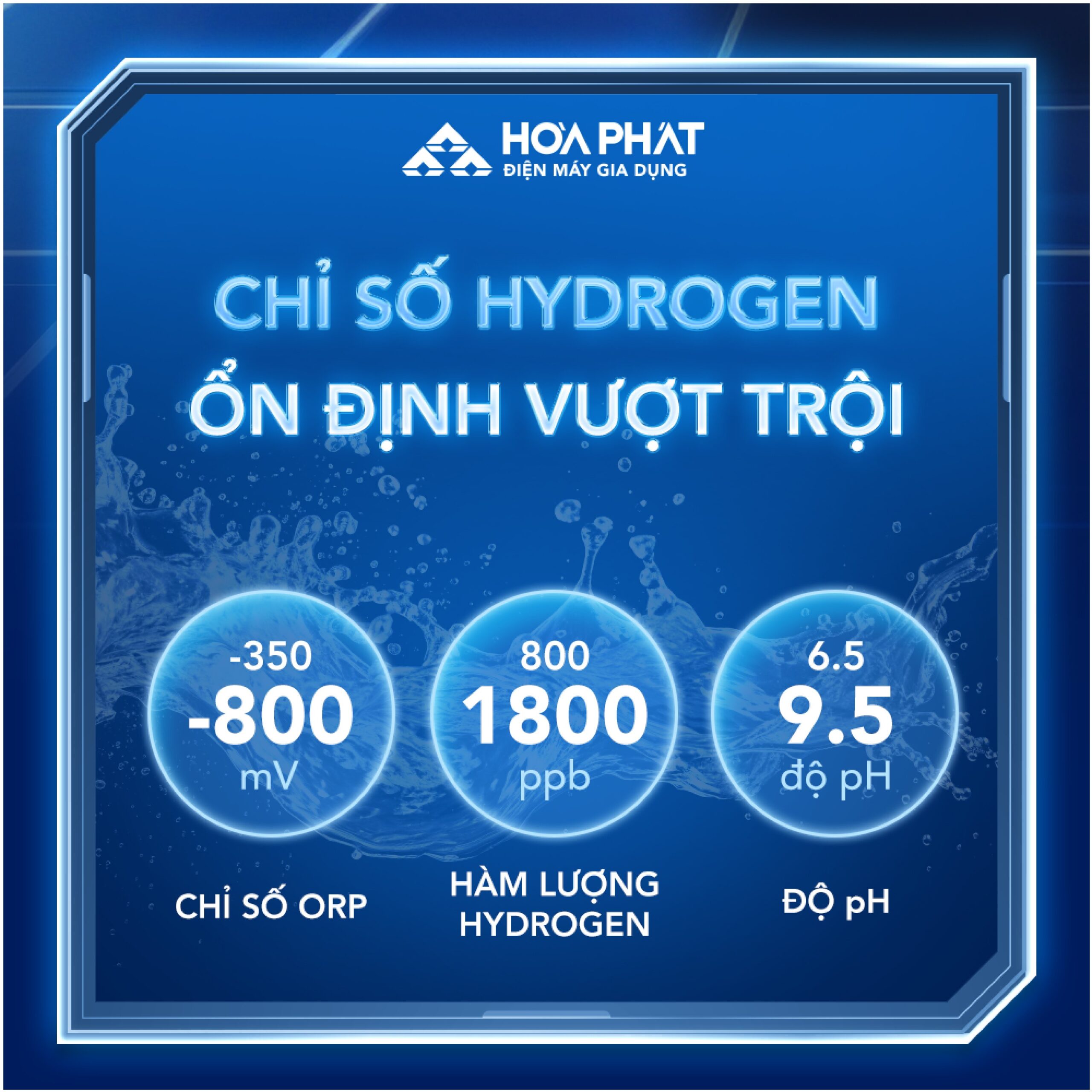 + Nước ion kiềm Hydrogen: có độ pH trong khoảng 6.5 – 9.5, hàm lượng Hydrogen từ 800 – 1800 ppb và chỉ số ORP âm sâu từ -350 đến -800 mV giúp hỗ trợ chống oxy hóa và cải thiện chỉ số kiềm – axit trong cơ thể.
