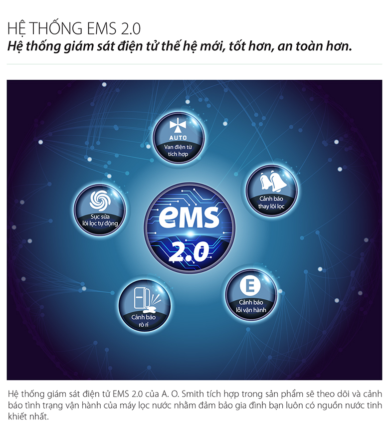 Máy lọc nước A. O. Smith G1 được trang bị hệ thống giám sát điện tử EMS 2.0, liên tục theo dõi và cảnh báo tình trạng vận hành của máy, đảm bảo máy luôn hoạt động tốt nhất. EMS 2.0 sẽ thông báo khi cần bảo trì hoặc thay lõi lọc, giúp duy trì chất lượng nước tinh khiết và đảm bảo máy lọc nước hoạt động bền bỉ theo thời gian, mang lại sự an tâm tuyệt đối