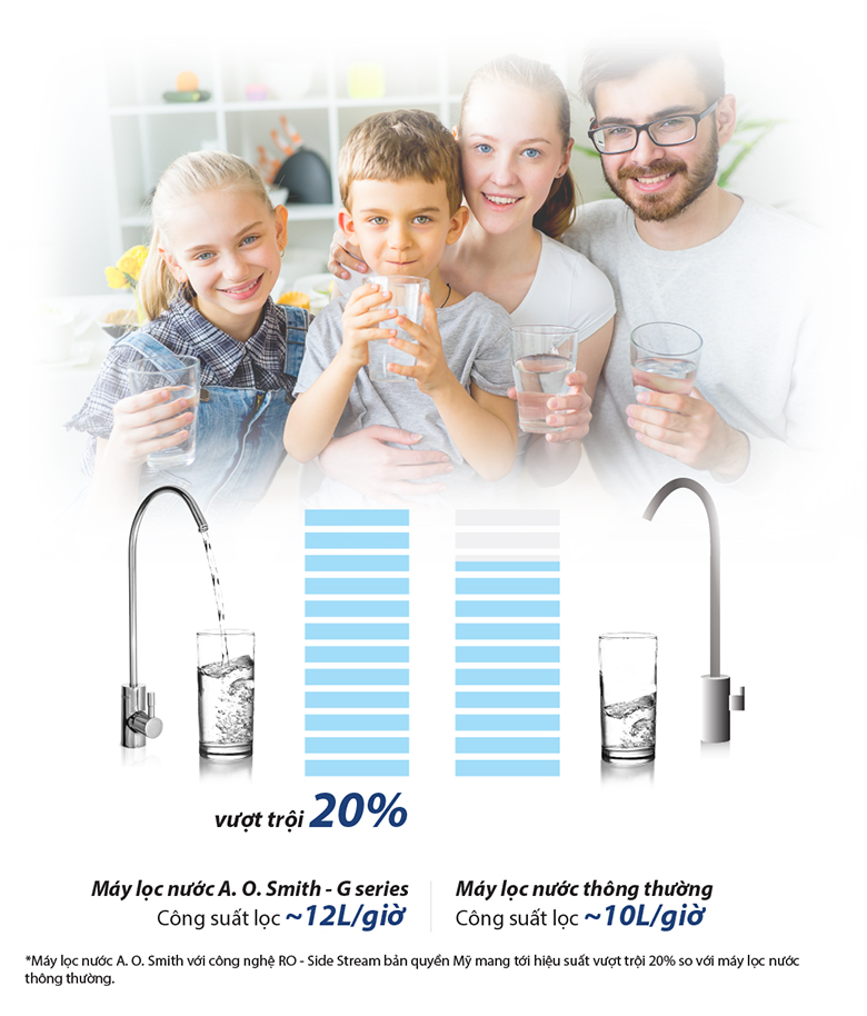 Máy lọc nước A. O. Smith G1 với công nghệ màng lọc RO-Side Stream độc quyền giúp tăng 66% lượng nước tinh khiết và giảm đến 56% lượng nước thải so với các công nghệ lọc thông thường. Điều này không chỉ giúp tiết kiệm nước, tối ưu hóa hiệu quả sử dụng mà còn giảm chi phí vận hành cho người dùng.