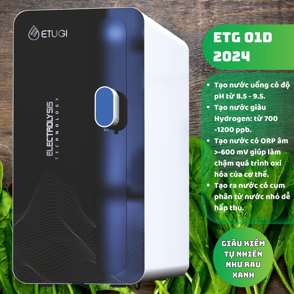 Hiện nay trên thị trường máy lọc nước ion kiềm thì Etugi chính là đơn vị tiên phong đi đầu trong lĩnh vực điện phân trực tiếp nước R.O mà không cần sử dụng lõi tạo kiềm hay lõi tạo khoáng. Sản phẩm sau điện phân là nước tốt với pH từ 8.5 – 9.5 giàu Hydrogen phân tử, thế oxi hóa khử ORP âm, cụm phân tử nước nhỏ và đặc biệt chứa hàm lượng khoáng Magie tốt cho sức khỏe tim mạch.