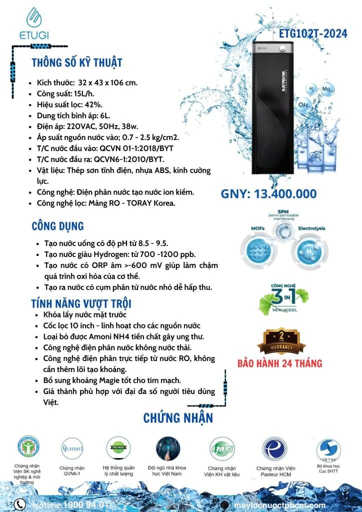 Máy Lọc Nước Ion Kiềm Etugi 3 in 1 – ETG 102T 2024 hoạt động dựa trên ứng dụng công nghệ độc quyền giải pháp hữu ích về việc ứng dụng thiết bị điện phân nước sử dụng điện cực Magie để tạo ra nước uống ion kiềm tại Việt Nam.