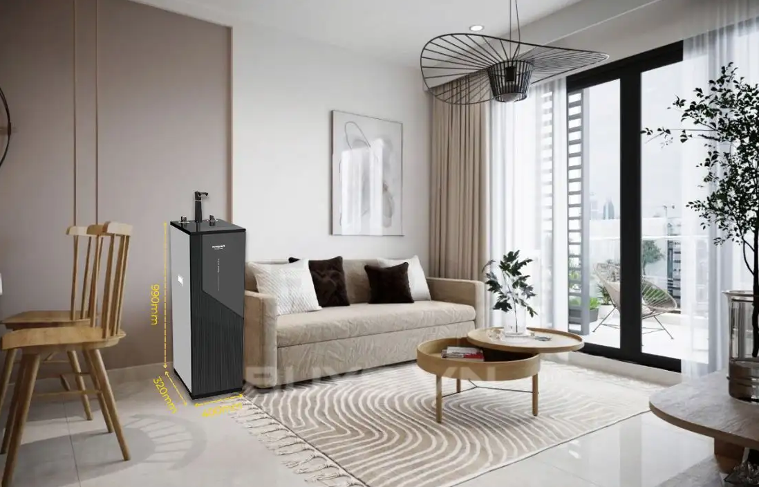 Máy lọc nước nóng lạnh Kangaroo Messi Hydrogen KG10A20 với thiết kế tủ đứng slim nhỏ gọn 320x400x990 mm với màu đen sang trọng