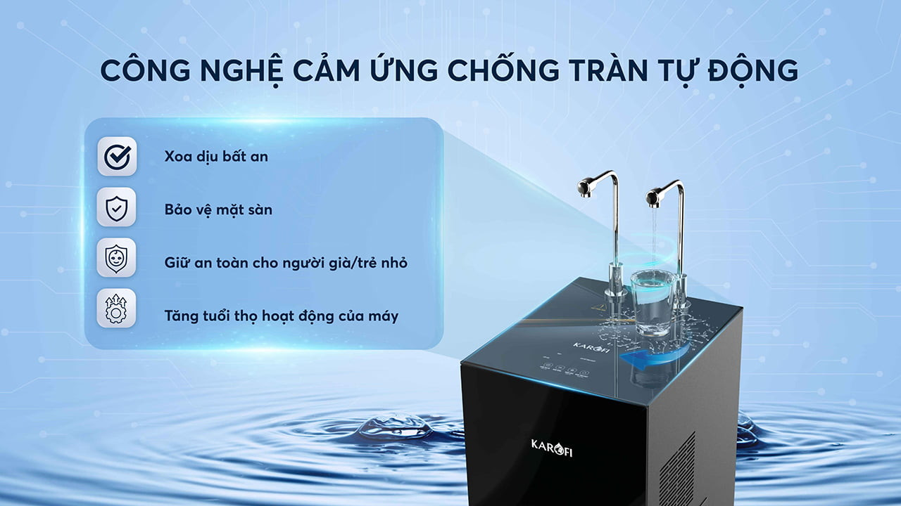 Lần đầu tiên, công nghệ cảm ứng chống tràn được trang bị trên một chiếc máy lọc nước tại Việt Nam. Ngay khi chip cảm ứng phát hiện nước tràn trên bề mặt, máy sẽ tự động ngắt nước chống sự cố chập điện và giữ vệ sinh khu vực máy lọc giúp người dùng an tâm khi sử dụng.