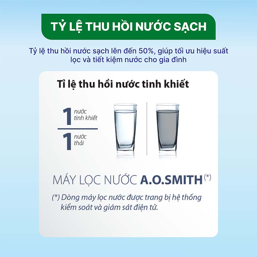 – Lõi RO – Side Stream: Công nghệ độc quyền của A.O. Smith được cấp bằng sáng chế tại Mỹ, có khả năng loại bỏ đến 99.9% kim loại nặng như chì, thủy ngân, Asen,… Giúp tăng 66% lượng nước tinh khiết, giảm 56% lượng nước thải, tăng 1.5 lần tuổi thọ lõi lọc giúp kéo dài tuổi thọ lên đến 3 năm. Lõi lọc RO – Side Stream được kiểm tra chất lượng và chứng nhận bởi Hiệp Hội Chất Lượng Nước Hoa Kỳ (WQA) cho tiêu chuẩn NSF/ANSI 58.