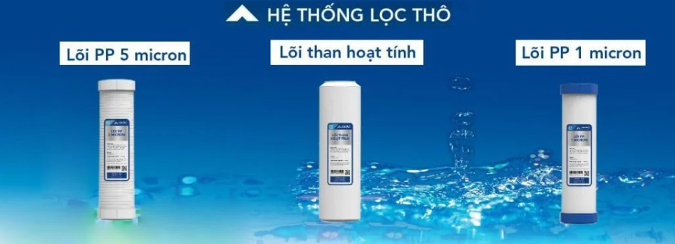 - Lõi PP 1 micron (Polypropylen): Giúp loại bỏ các chất cặn bẩn, tảo rêu và các chất rắn khác có kích thước trên 1 micron lẫn trong nước. Khuyến nghị thay lõi từ 3 – 6 tháng tùy vào chất lượng nước nguồn.