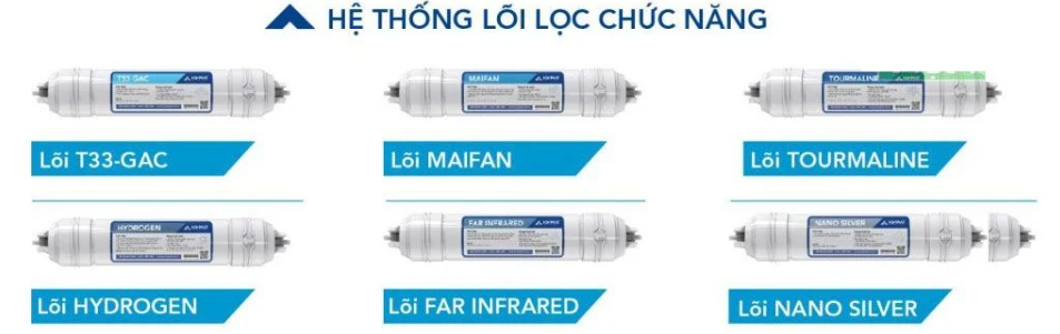 - Lõi lọc hồng ngoại xa FAR INFRARED: Có cấu tạo từ than hoạt tính gáo dừa và bóng gốm hồng ngoại xa. Lõi lọc chữa các bóng gốm có khả năng hấp thụ năng lượng nhiệt bên ngoài để phát ra tia hồng ngoại xa, giúp nước được hoạt hóa dễ hấp thụ vào cơ thể. Thời gian sử dụng của lõi lọc 12 tháng 10.000 lít nước.