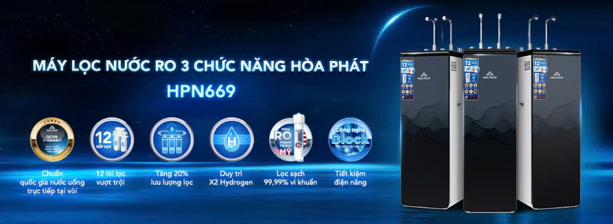 – Máy lọc nước RO HPN669 thuộc dòng sản phẩm máy lọc nước thế hệ mới đến từ Hòa Phát với nhiều cải tiến về tính năng hiện đại, thông minh, được trang bị 3 chế độ Nóng – Lạnh – Tinh khiết cùng với thiết kế tủ đứng với vỏ tủ được cấu tạo bằng thép màu trắng kết hợp mặt kính cường lực đen tuyền, phù hợp lắp đặt ở mọi không gian trong nhà bạn. Đồng thời, HPN669 có 12 lõi lọc mạnh mẽ cùng lõi lọc chính là màng RO 75GPD Dupont Filmtec từ Mỹ đạt tiêu chuẩn NSF/ANSI 58