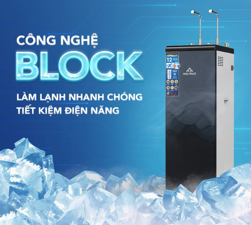 – Máy lọc nước RO nóng lạnh Hòa Phát HPN669 sử dụng công nghệ làm lạnh sâu và nhanh bằng Gas R600a với Block hiệu suất cao COP 0.9, giúp lạnh nhanh hơn 50% so với loại thông thường, giúp giải khát nhanh trong thời tiết oi bức đồng thời tiết kiệm điện năng, giảm chi phí điện hàng tháng cho gia đình bạn.