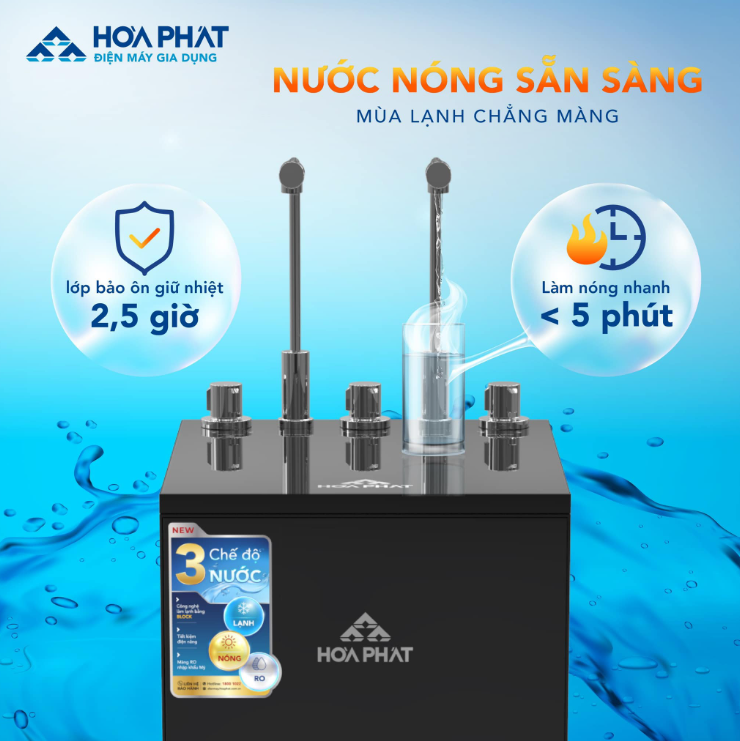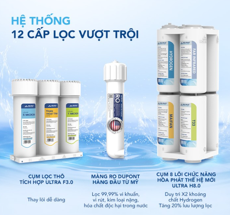 – Để đảm bảo nguồn nước đầu ra được tinh khiết và an toàn cho sức khỏe của người sử dụng, Hòa Phát đã trang bị 12 cấp lọc mạnh mẽ cùng với cụm 8 lõi chức năng Ultra H8.0 thế hệ mới giúp nâng cao chất lượng nước, bổ sung khoáng chất và chống oxy hóa.