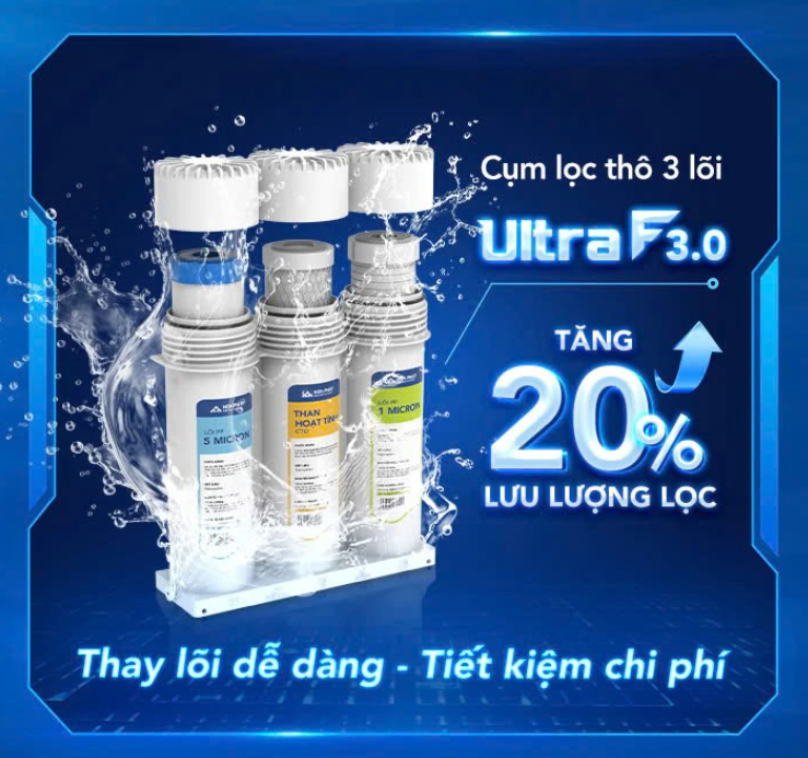 – Bộ lõi lọc thô 123 Ultra F3.0 thế hệ mới là bước lọc đầu tiên, giúp chặn các chất bẩn, màu mùi vị, chất hữu cơ trước khi vào màng RO. Đồng thời, tăng 20% lưu lượng nước qua bộ lọc và giảm nguy cơ tắc nghẽn nhờ thiết kế liền mạch của cụm 3 cốc.