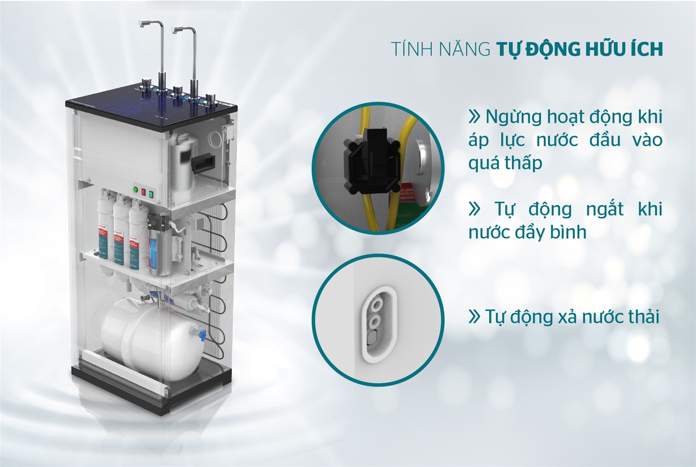 Máy lọc nước R.O nóng lạnh SUNHOUSE SHA76215CK được trang bị nhiều tính năng tự động hiện đại như: ngừng hoạt động khi áp lực nước đầu vào quá thấp, tự động ngắt khi nước đầy bình và tự động xả nước thải.