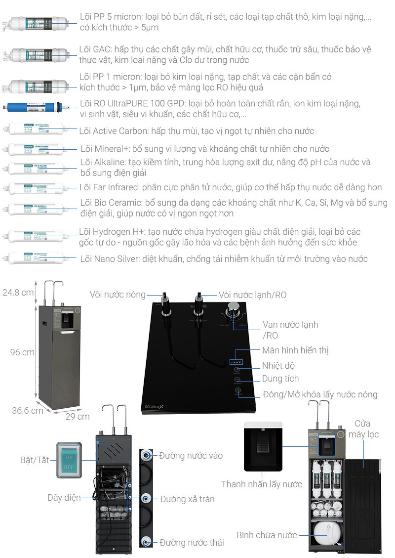 – Lõi Bio Ceramic (sản xuất Việt Nam): bổ sung các loại khoáng chất như K, Ca, Si, Mg,… giúp nước trở nên giàu dinh dưỡng và có lợi cho sức khỏe.