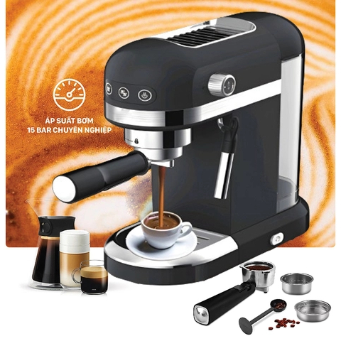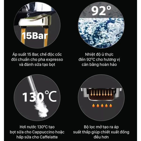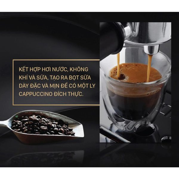 Với áp lực bơm 15 bar chuyên nghiệp, chế độ cốc đôi chuẩn cho pha expresso và đánh sữa tạo bọt sẽ mang đến những tách cà phê Espresso nguyên chất, đậm đà và có bọt nâu tạo hương hấp dẫn, máy được tích hợp hệ thống đánh bọt dành cho các bạn yêu thích Cappuccino hay Caffelatte.