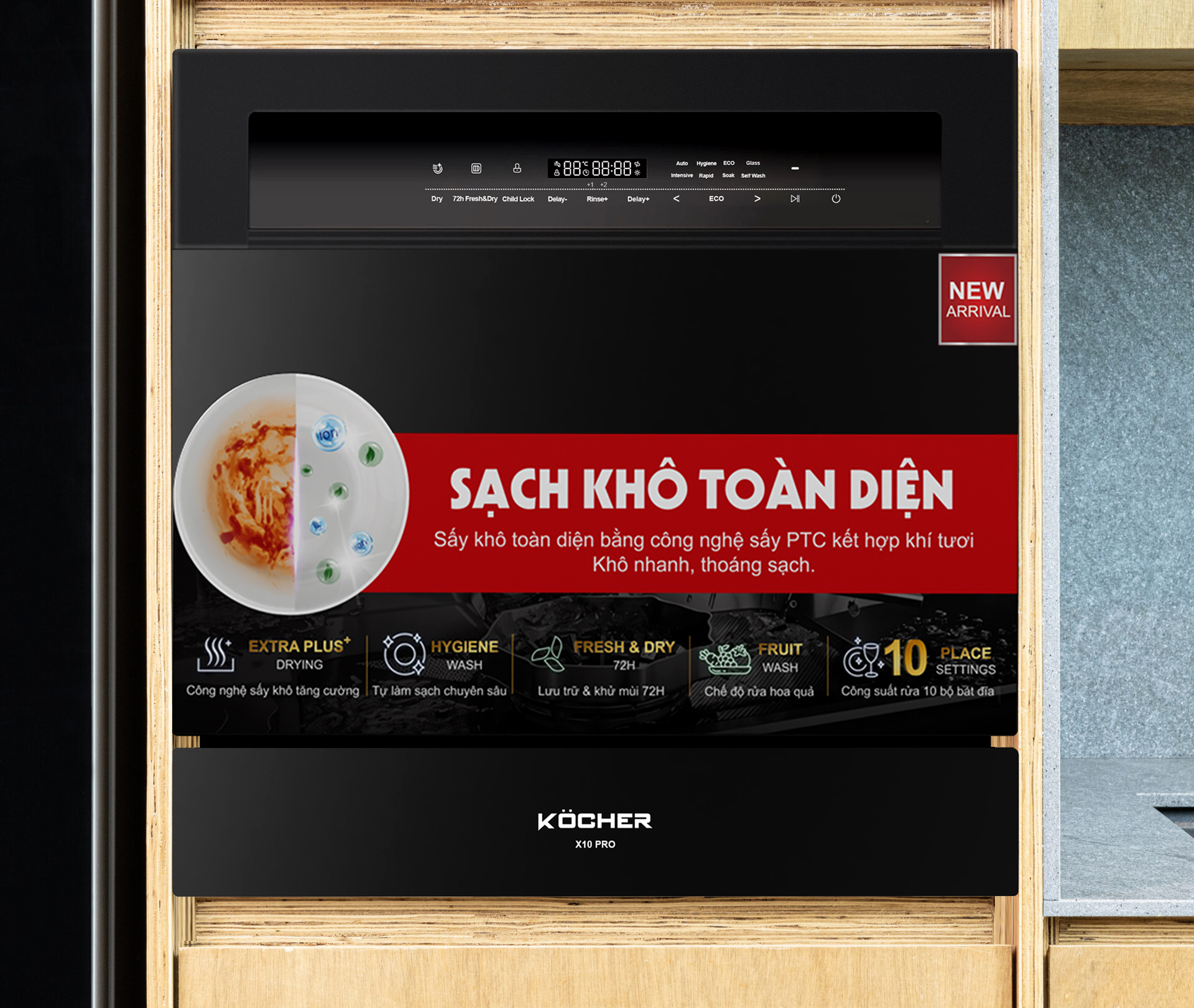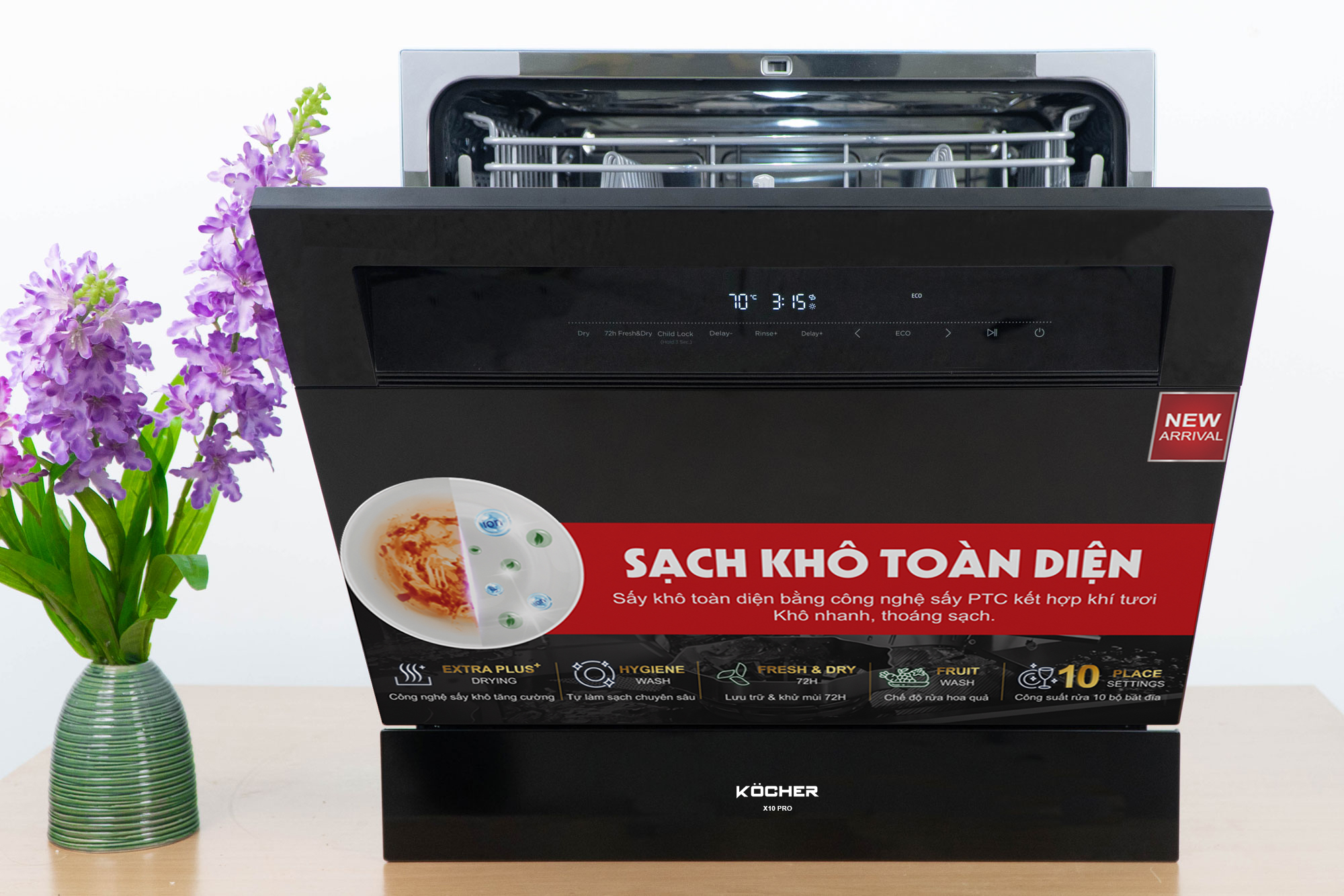 Tăng tính thẩm mỹ cho gian bếp gia đình: Thiết kế nhỏ gọn, hiện đại máy rửa bát 10 bộ Kocher X10 PRO dễ dàng chinh phục được mọi không gian bếp. Màu đen bóng sang trọng, tinh tế tới từng chi tiết, không khó để tạo điểm nhấn nổi bật.