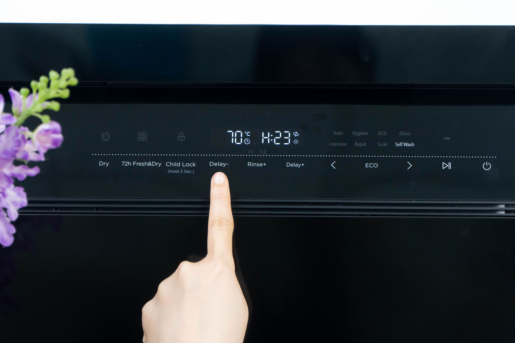 Hẹn giờ trễ hoạt động 1-24h | Delay -/+: Chức năng hẹn thời gian máy bắt đầu hoạt động. Nhấn nút “Delay+” để tăng thời gian hẹn giờ hoặc nhấn nút “Delay-” để giảm thời gian hẹn giờ, có thể hẹn tối đa 24 giờ.