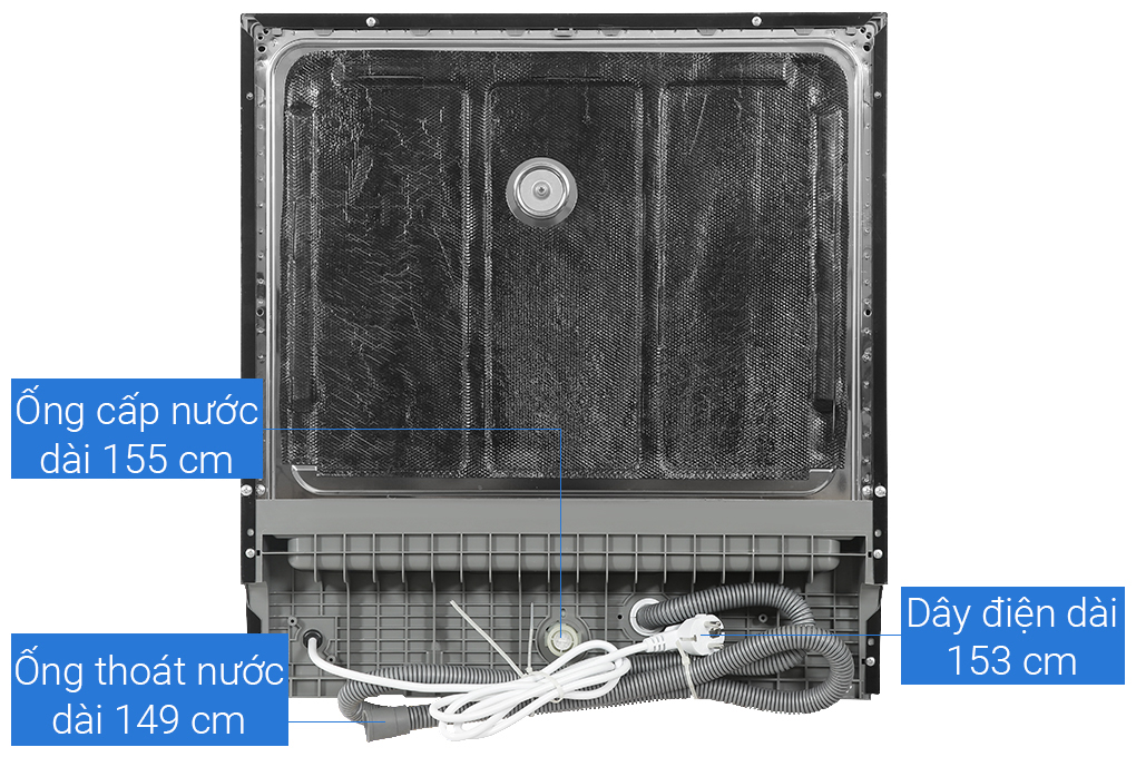 Mặt đằng sau sẽ toàn bộ khung màu đen, chứa ống thoát nước dài 149cm và ống cấp nước dài 155cm. Ngoài ra còn hệ thống dây điện dài 153cm. Tất cả những vật dụng liên quan đến dây điện, ống dẫn nước được sắp xếp ở mặt sau để tiết kiệm diện tích và đảm bảo tính thẩm mỹ cho máy rửa bát Kocher X10 PRO.