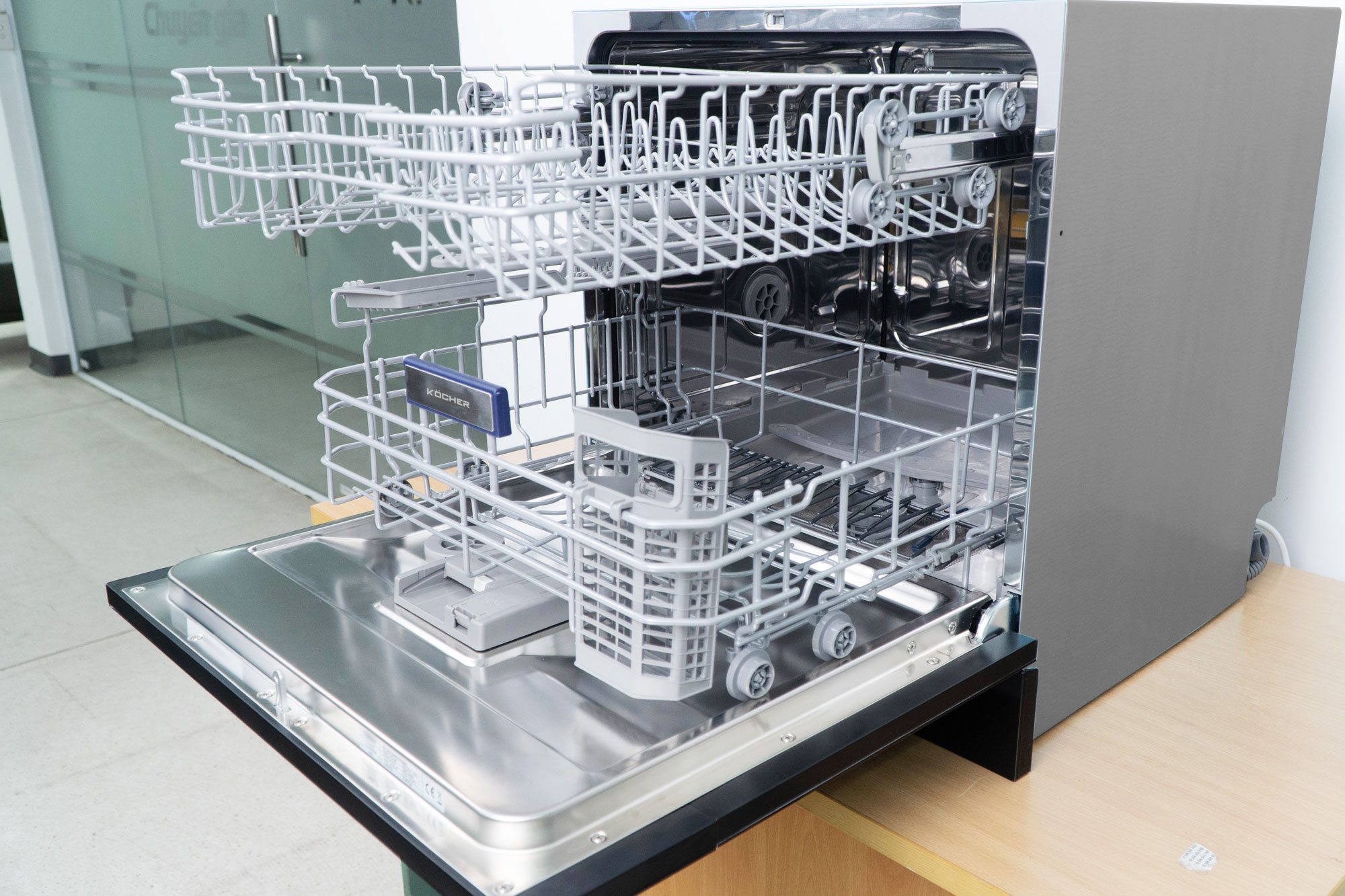 Máy rửa bát Kocher X10 PRO có 2 khay rửa di động hay còn gọi là 2 giá rửa bát đĩa. Khay trên là khay tiếp xúc gần sát với phần trán lắp trên của máy. Khay trên chủ yếu rửa các loại bát đĩa nhỏ, cốc, ly, vật dụng nhỏ không tốn diện tích.