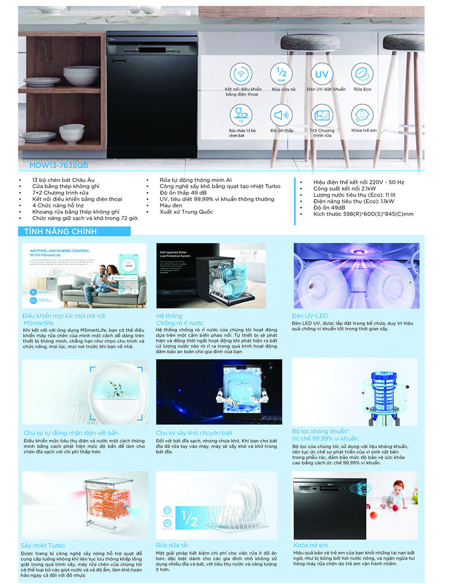 Với những tính năng vượt trội và thiết kế tinh tế, máy rửa bát Midea MDW13-7635QB là giải pháp hoàn hảo cho các gia đình bận rộn, giúp tiết kiệm thời gian và công sức trong việc chăm sóc nhà bếp. Sản phẩm không chỉ làm sạch, sấy khô mà còn đảm bảo sự an toàn, tiện lợi cho người sử dụng.