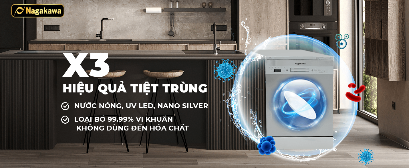 Máy rửa bát Nagakawa NK15D03M sử dụng công nghệ UV LED có khả năng loại bỏ tới 99.99% vi khuẩn mà không cần sử dụng hóa chất. Công nghệ này hoạt động trên cơ chế phá hủy các liên kết DNA trong tế bào virus, vi khuẩn, nhờ đó tiêu diệt và vô hiệu hóa chúng một cách dễ dàng. Chưa dừng lại ở đó, công nghệ diệt khuẩn bằng NANO SILVER là công nghệ hiện đại đang được ứng dụng rộng rãi, mang lại hiệu quả triệt để và an toàn hơn. Trong mỗi máy rửa bát Nagakawa sẽ có các túi đựng Nano bạc để tiêu diệt vi khuẩn và nấm. Với nước nóng và cộng hưởng của 2 công nghệ tiên tiến diệt khuẩn, bát đĩa được tiệt trùng hiệu quả gấp 3 lần so với các sản phẩm máy rửa bát thông thường giúp bữa ăn thêm an toàn, bảo vệ sức khỏe.