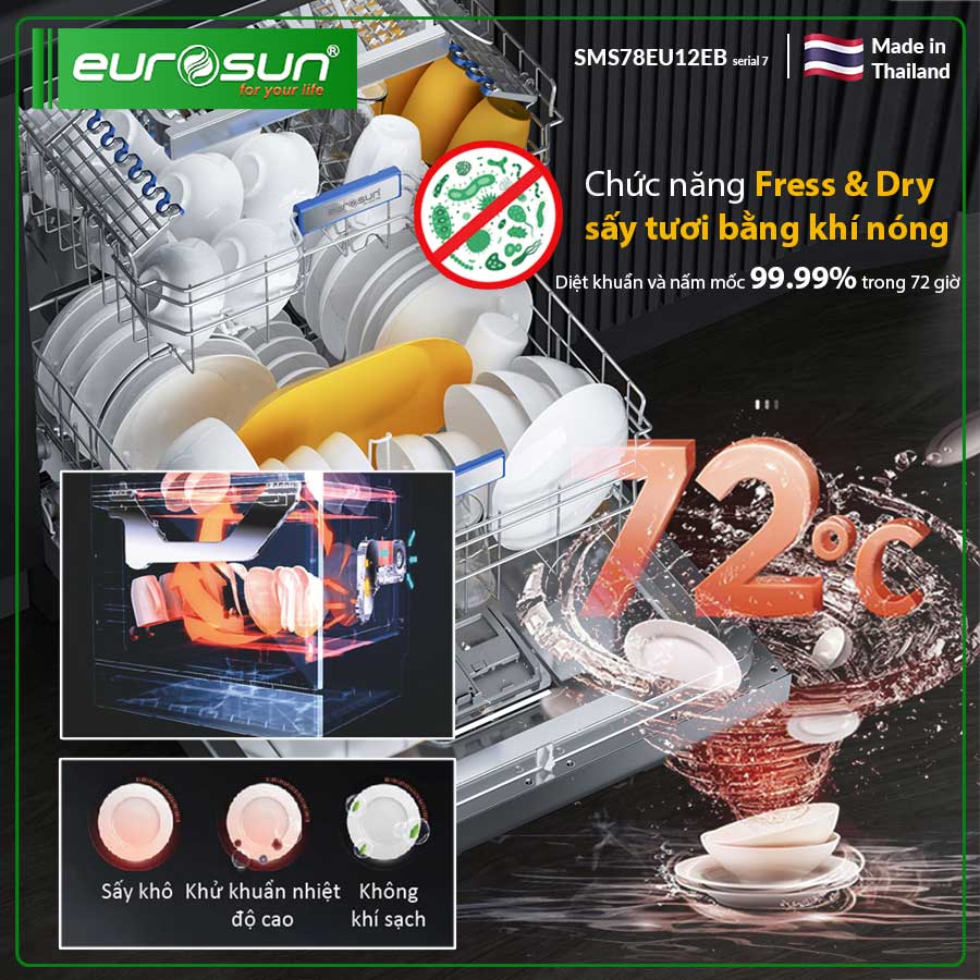 Chức năng Fresh&Dry là chức năng sấy tươi bằng khí nóng, sau quy trình rửa chức năng này sẽ được khởi động và thổi luồng khí tươi nóng giúp cho các vật dụng trong máy rửa bát được khô ráo và được diệt khuẩn, nấm mốc đến 99.99% trong 72 giờ với một lượng điện nhỏ cho cả quy trình. Nó đảm bảo cho bát đĩa luôn được nóng ấm và vô trùng tránh nấm mốc như mới rửa xong.